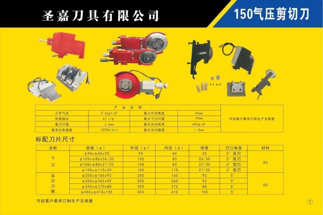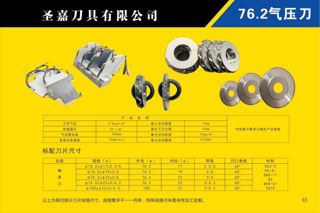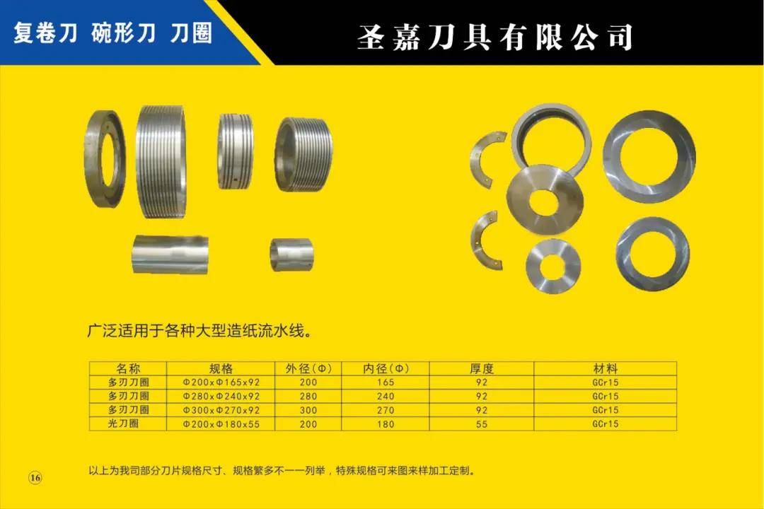 本公司所生產的各種型號規(guī)格分切、分條、分紙、復卷機圓刀片(蝶形上刀片、上刀架、下刀片、隔片、隔套、底棍、復卷刀、碗形刀、刀圈、大回旋圓切刀、砂輪、壓花輪、折疊刀、齒刀、異形刀)橫切刀、裁切刀、熱切刀、粉碎刀、切粒刀、撕碎刀、折頁刀、開槽刀、油墨刮刀、切臺圓刀、三孔刀、切管刀、氣壓刀組、剪切刀組、熱切刀組廣泛適用于造紙、紙制品加工、膠粘帶制品、薄膜、電線電纜、橡膠、輪胎、鋁箔、化纖、非織造布、復合包裝、卷煙、皮革、印刷、服飾輔料等行業(yè)。