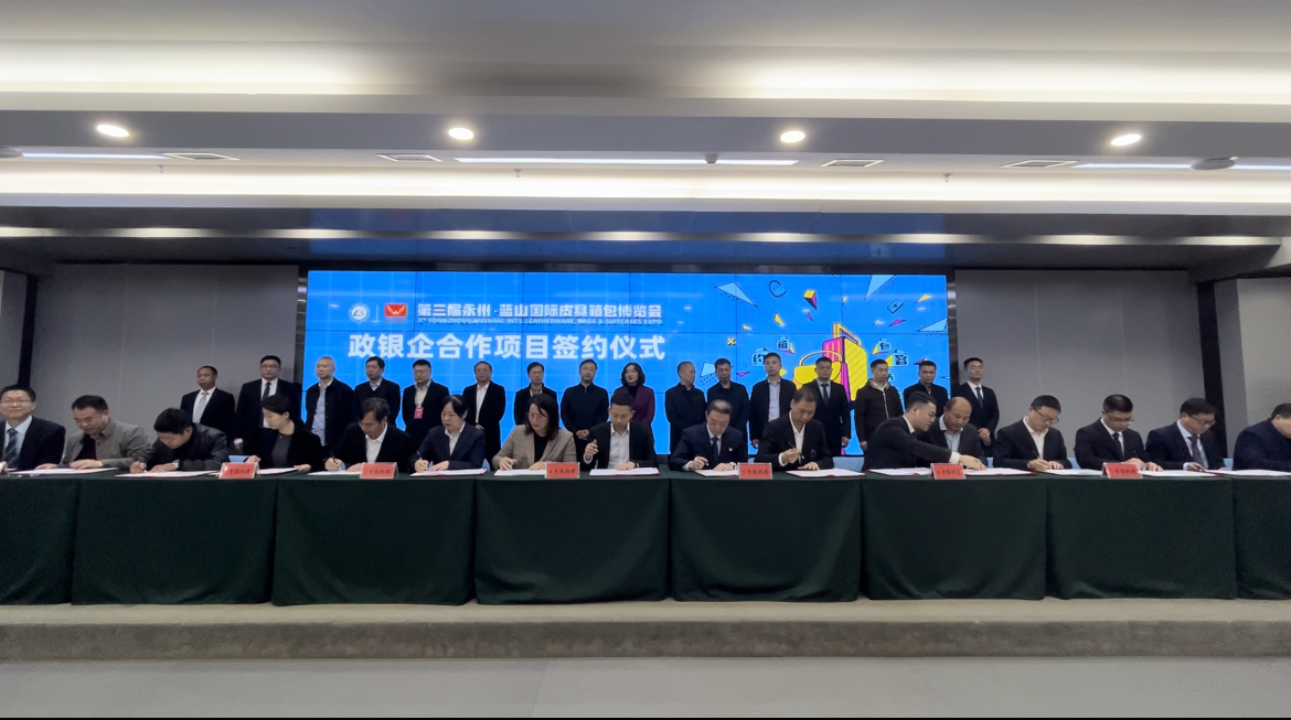 3月24日上午,第三屆永州·藍(lán)山國際皮具箱包博覽會開幕后,藍(lán)山縣舉行政銀企合作項目簽約儀式。永州市政府副秘書長肖瀟、永州市人民銀行中心支行行長王一凡、永州市銀保監(jiān)分局二級調(diào)研員李樹屏、永州市優(yōu)化辦主任文貽榮、永州市各銀行機構(gòu)主要負(fù)責(zé)人以及藍(lán)山縣委副書記、縣長鄧群,縣委常委、常務(wù)副縣長張國材,副縣長劉建軍等領(lǐng)導(dǎo)參加了儀式。